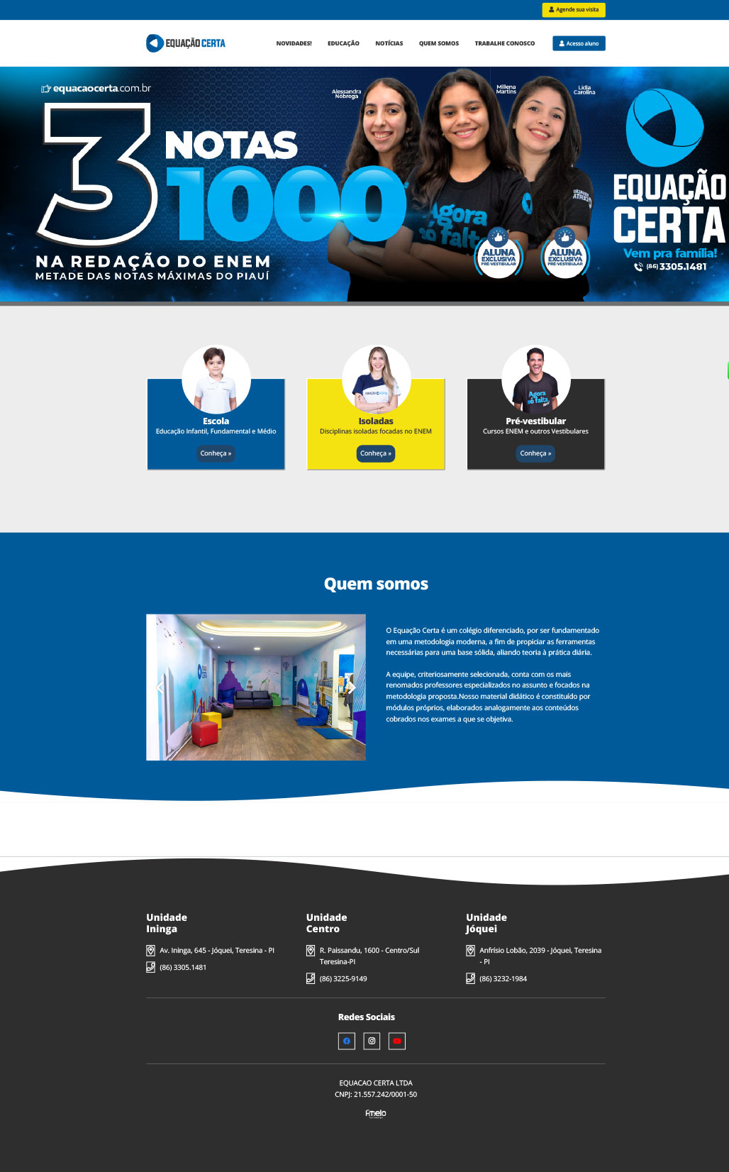 Com foco em excelência acadêmica e inovação, o site do Colégio Equação Certa apresenta uma estrutura moderna e organizada, destacando conquistas expressivas como notas máximas no ENEM. A navegação é clara e segmentada, com seções dedicadas à Educação Infantil, Fundamental, Ensino Médio, Pré-vestibular e disciplinas isoladas. O conteúdo valoriza a metodologia própria da instituição, que alia teoria à prática e conta com uma equipe altamente qualificada. Informações institucionais, unidades, redes sociais e agendamento de visitas estão facilmente acessíveis, refletindo o compromisso da Equação Certa com a formação integral e personalizada de seus alunos.
