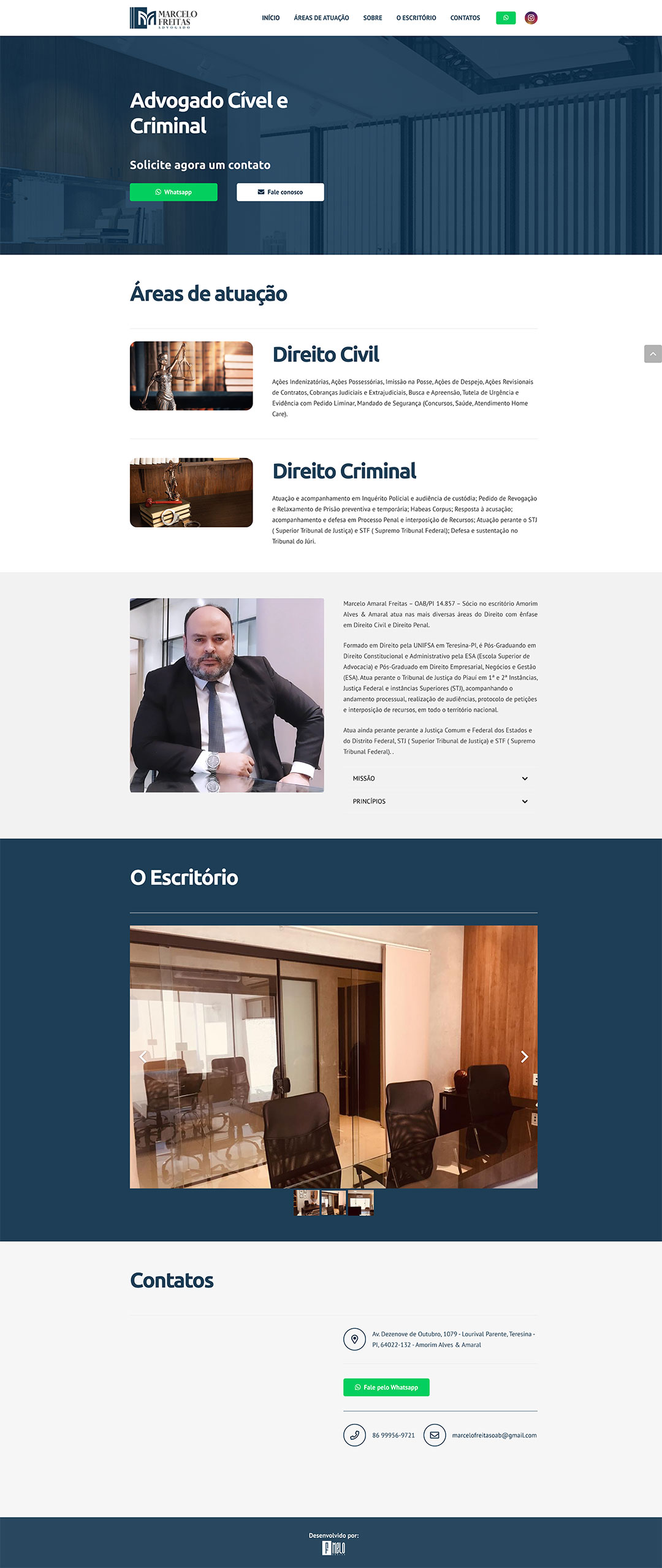 O site do advogado Marcelo Freitas oferece uma navegação clara e direta, destacando as principais áreas de atuação: Direito Civil e Direito Criminal. Com design profissional e linguagem acessível, a plataforma apresenta a trajetória do advogado, os serviços oferecidos e os diferenciais do escritório. Também facilita o contato direto com o profissional por meio de WhatsApp e canais tradicionais, reforçando a confiança e a proximidade com os clientes.