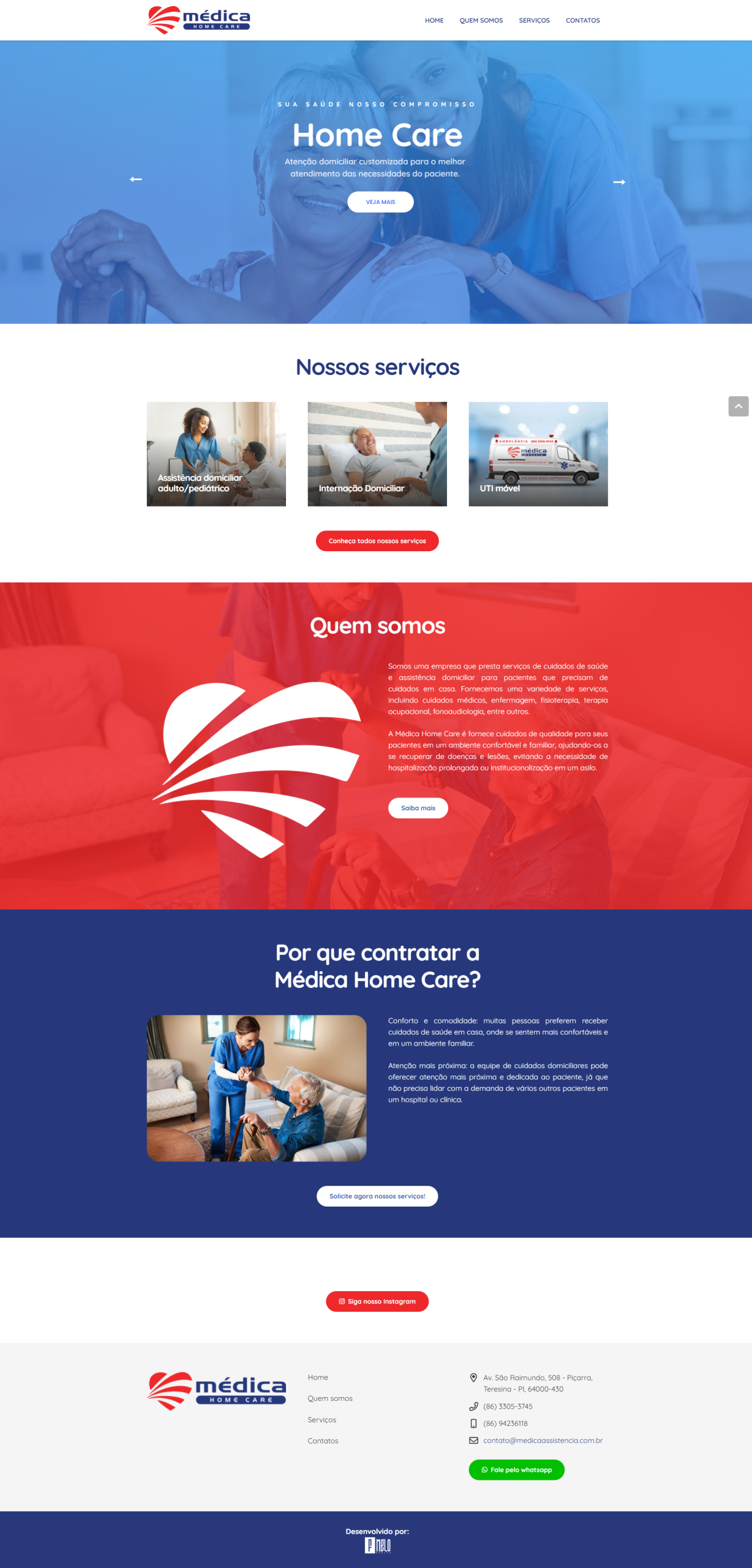 O site da Médica Home Care comunica de forma clara e acolhedora sua proposta de atendimento domiciliar humanizado. Com um layout intuitivo e cores bem definidas, destaca os principais serviços prestados — como assistência domiciliar, internação em casa e UTI móvel — além de apresentar a missão da empresa: oferecer cuidados de saúde com qualidade e conforto no ambiente familiar. É uma plataforma que reforça a confiança e a proximidade essenciais nesse tipo de serviço.