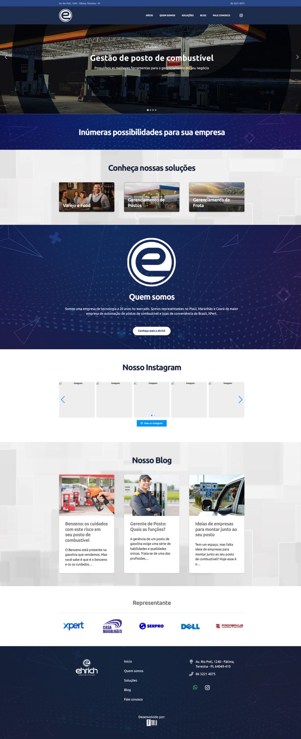 Com foco em tecnologia e eficiência, o site da Ehrich apresenta soluções em automação para postos de combustíveis, lojas de conveniência, gestão de frota e varejo alimentar. A interface é moderna, com navegação intuitiva e informações claras sobre os serviços oferecidos. A página também destaca os parceiros da empresa, conteúdos do blog e integração com redes sociais, reforçando a expertise da Ehrich, que atua há mais de 20 anos no mercado como representante oficial de grandes marcas no Piauí, Maranhão e Ceará.